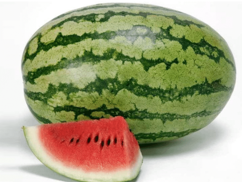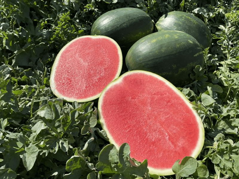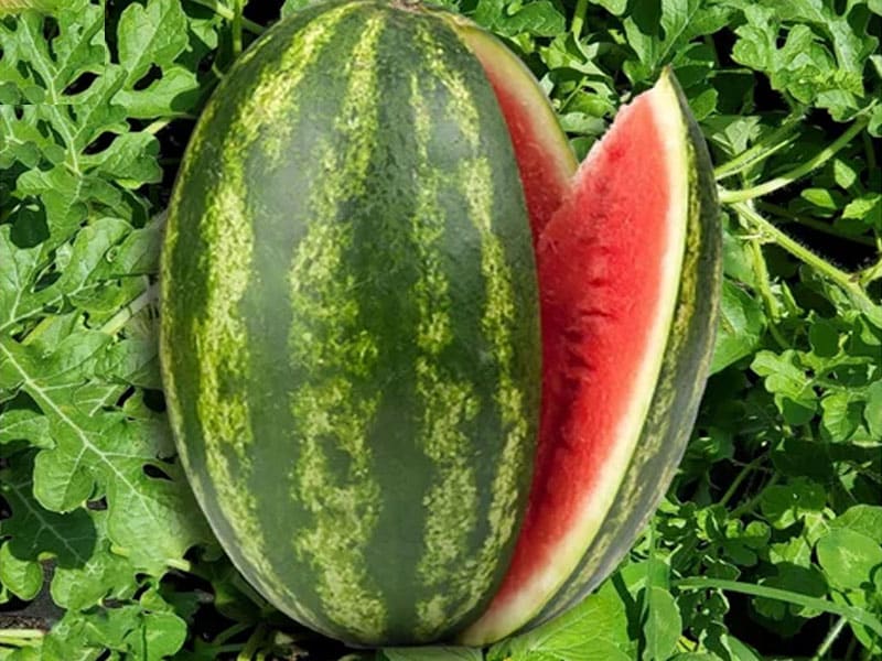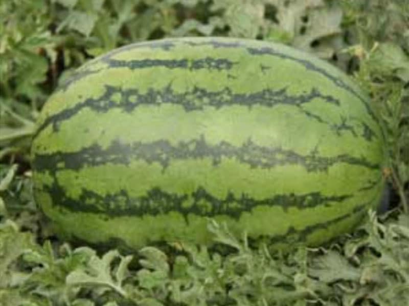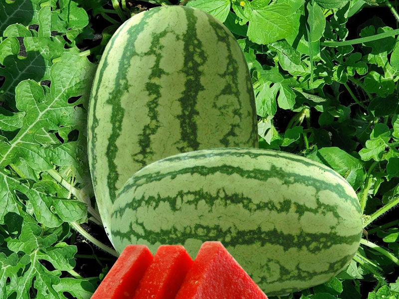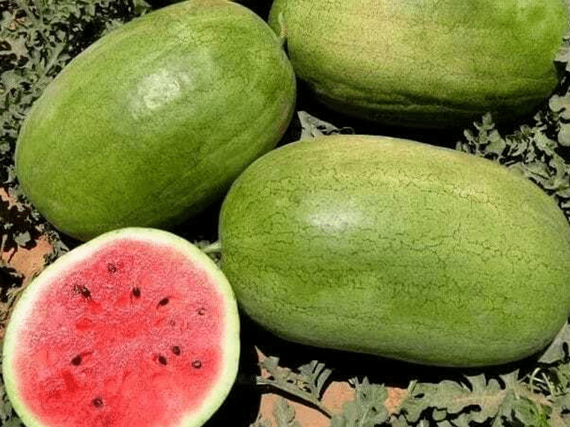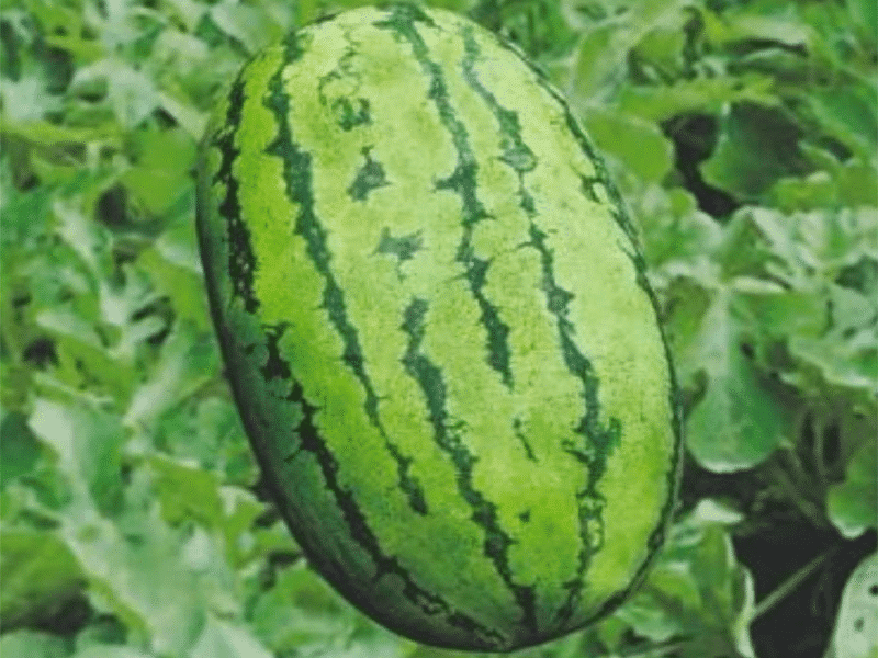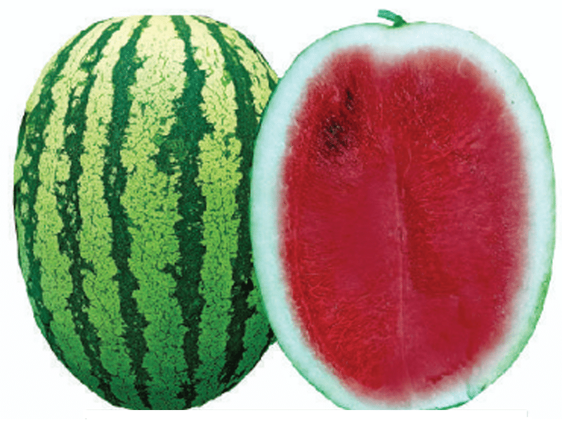 Fruit : Oval-oblong shape, rm, light green, thick rind with distinctive green stripes. Weighs 7-10 kg, deep crimson red colour esh, good texture with good TSS of 11-12%