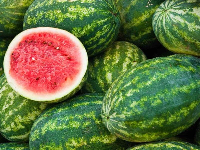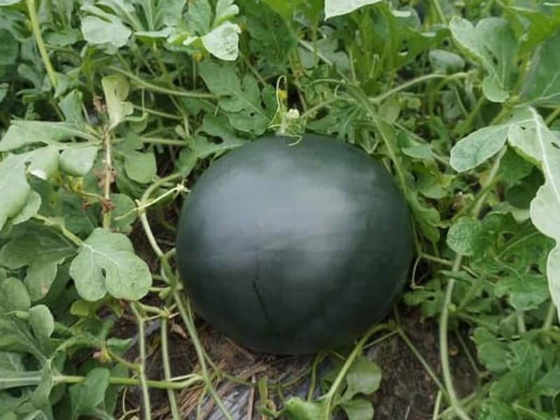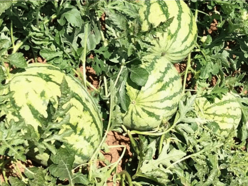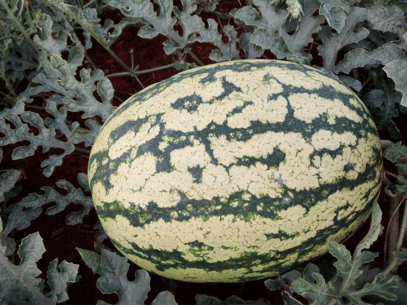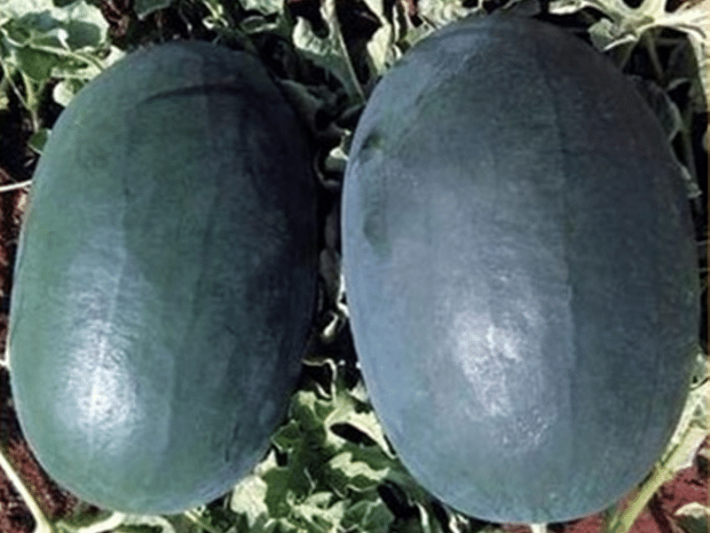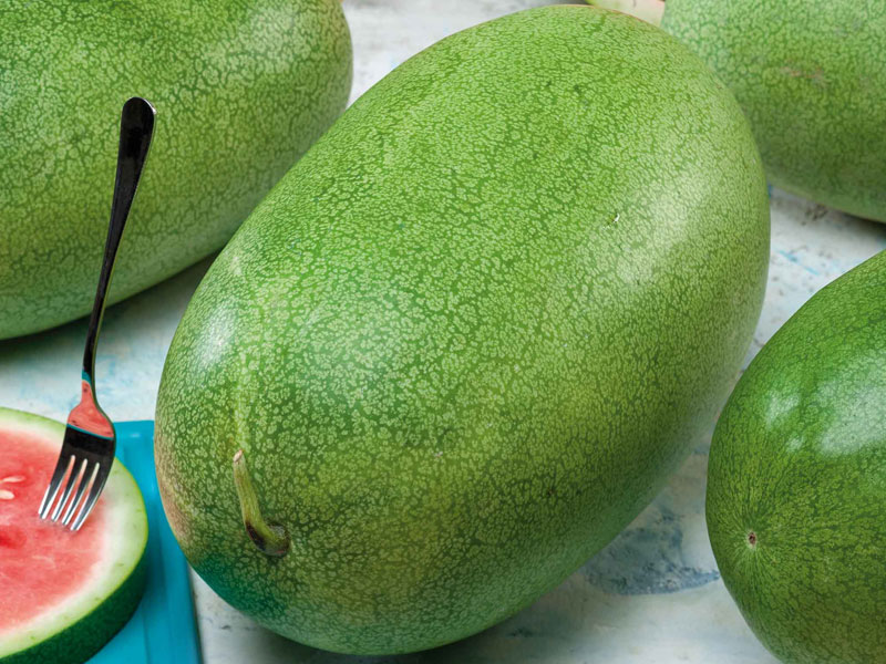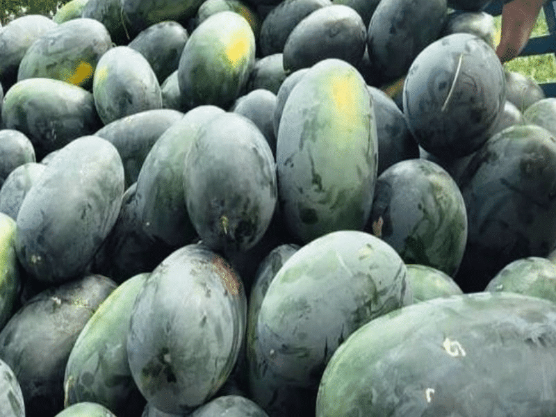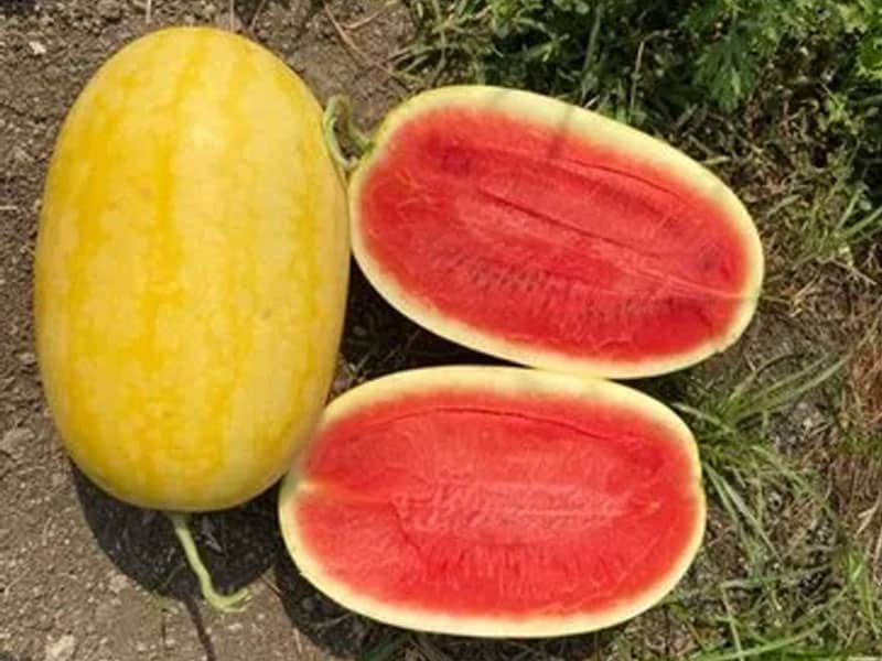 Fruit : Oval-oblong shape, rm, light green, thick rind with distinctive green stripes. Weighs 7-10 kg, deep crimson red colour esh, good texture with good TSS of 11-12%