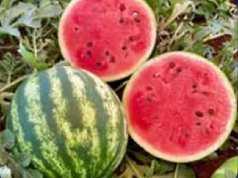 Fruit : Oval-oblong shape, rm, green, thick rind with distinctive dark green stripes. It weighs 7-10 kg, esh is deep crimson red colour, good texture with good TSS of 11-12%