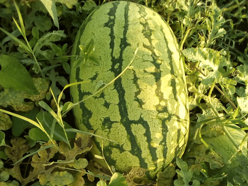 Fruit : Oval-oblong shape, rm, light green, thick rind with distinctive green stripes. Weighs 7-10 kg, deep crimson red colour esh, good texture with good TSS of 11-12%
